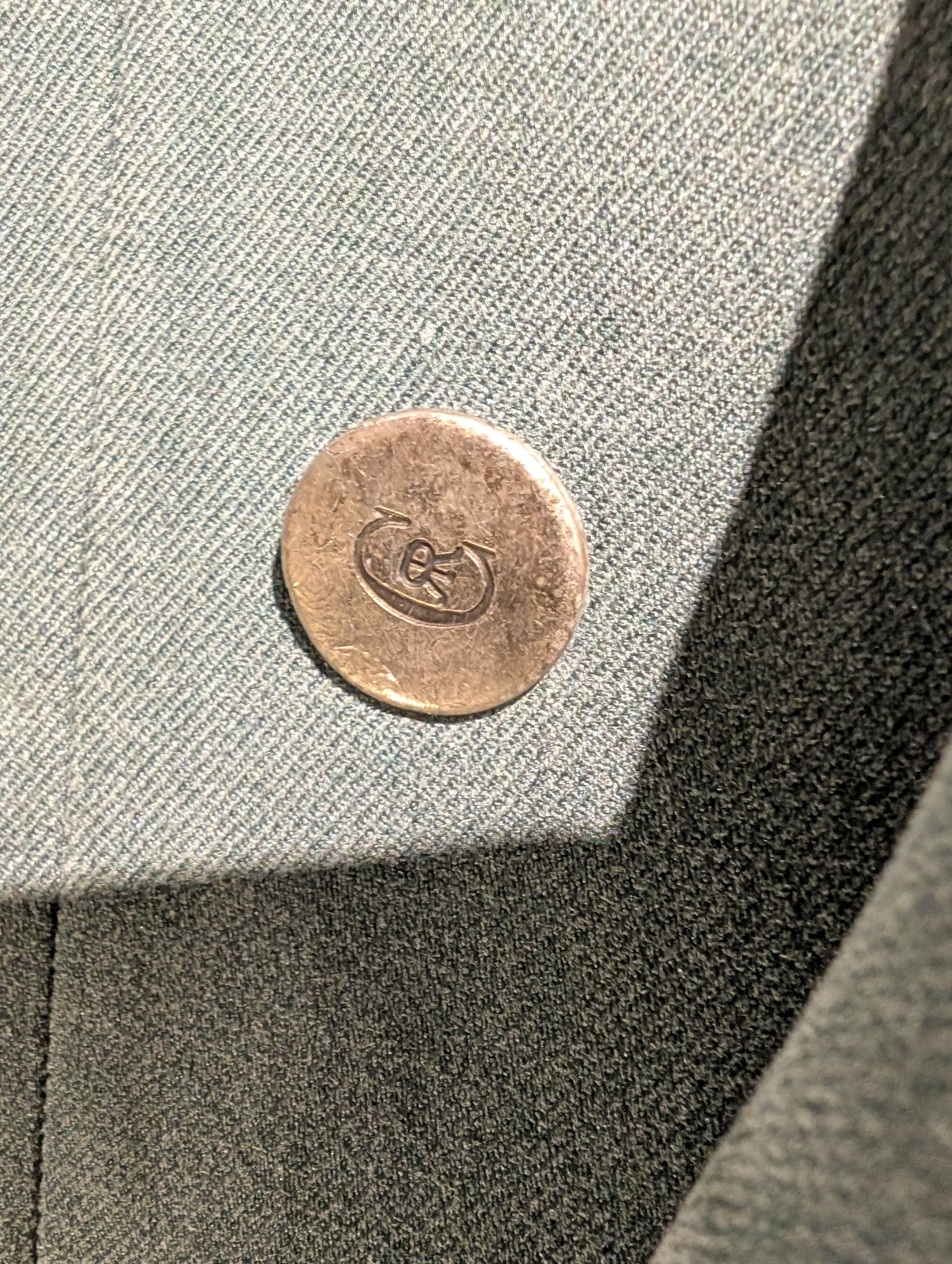 大きもなラペルに銀ボタンのエレガンス感もあり